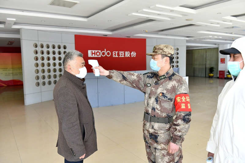 謝軍,是這次紅豆防護(hù)服生產(chǎn)大樓的安全生產(chǎn)負(fù)責(zé)人,也是一名退役軍人,他每天都要對(duì)進(jìn)入大樓的員工進(jìn)行排查,檢測(cè)好生產(chǎn)工人的體溫。每天早晨7點(diǎn),他已站在大樓門口,面對(duì)陸陸續(xù)續(xù)來(lái)上班的員工,謝軍和同事一起為每位準(zhǔn)備進(jìn)入的員工進(jìn)行體溫測(cè)量。從大年初二至今,謝軍便以廠為家,連續(xù)多日開展疫情防控工作,未曾回過(guò)家。近幾日,低于零下的冬季清晨,伴著刺骨的寒風(fēng),讓人忍不住打冷顫。