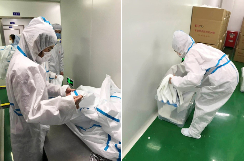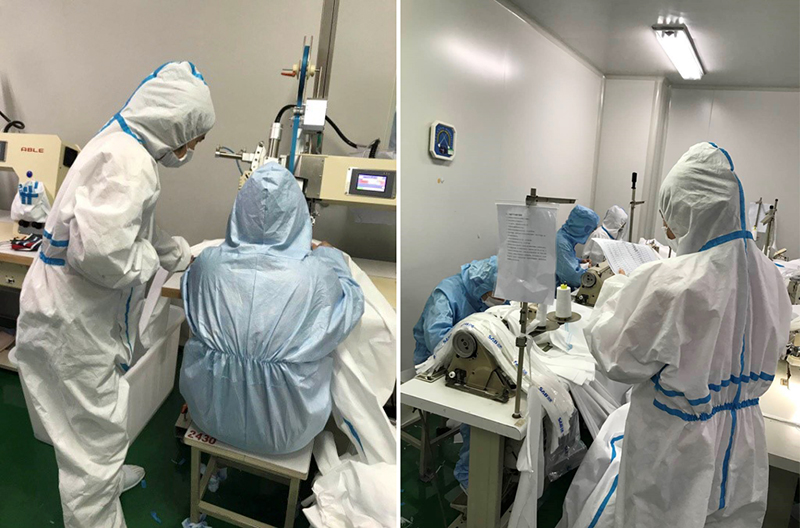 湯俊飛介紹說(shuō):“生產(chǎn)醫(yī)用防護(hù)服與生產(chǎn)民用防護(hù)服是完全不同的,這是我從未接觸的領(lǐng)域,所以我也在向?qū)I(yè)人士學(xué)習(xí)。”醫(yī)用防護(hù)服的生產(chǎn)不僅對(duì)于生產(chǎn)環(huán)境標(biāo)準(zhǔn)嚴(yán)格,需要按照無(wú)菌環(huán)境建設(shè),將空氣中的微粒子、細(xì)菌等污染物排除,確保制作時(shí)不受污染,而且在面料、工藝方面也有很高要求。從面料輔料的采購(gòu)、打樣,到調(diào)試機(jī)器、縫紉,每一項(xiàng)流程都要嚴(yán)格按照國(guó)家標(biāo)準(zhǔn)出發(fā),尤其讓湯俊飛及技術(shù)人員感到頭疼的是對(duì)于縫紉的特殊要求,他們根據(jù)不同類型的面料經(jīng)過(guò)不斷地調(diào)整測(cè)試后,終于將膠條機(jī)調(diào)試成功。技術(shù)難關(guān)被逐個(gè)攻破,生產(chǎn)也進(jìn)入加速階段。