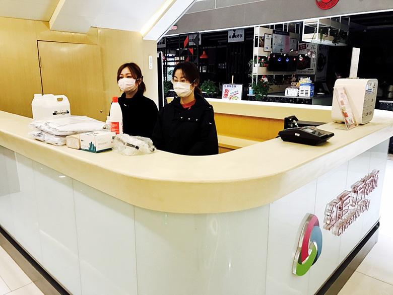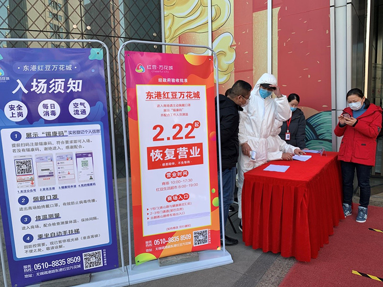 位于無錫的東港紅豆萬花城內(nèi)燈火輝煌,遍布4層樓的大小店鋪相繼開門營(yíng)業(yè)。“2月末,無錫中山路紅豆萬花城、東港紅豆萬花城恢復(fù)營(yíng)業(yè),我們按照政府相關(guān)規(guī)定要求進(jìn)入商城的顧客必須佩戴口罩,配合測(cè)溫、展示‘錫康碼’。本月,我們分布在無錫及鎮(zhèn)江的各紅豆萬花城商業(yè)綜合體都相繼恢復(fù)了營(yíng)業(yè)?!?月27日上午,東港紅豆萬花城入口處,工作人員給兩位客人邊量體溫邊說,只見一邊,消毒用品、洗手液、紙巾等一應(yīng)齊全。
