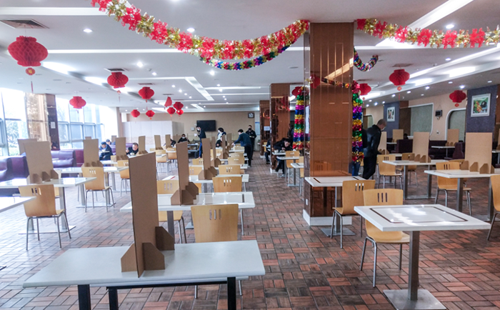 兵馬未動(dòng)糧草先行。在復(fù)工之前,公司利用現(xiàn)有資源通過各種渠道采購了大量口罩,防護(hù)服、酒精、消毒液等防疫物資也已全部到位。公司食堂實(shí)行人員錯(cuò)峰分流措施,員工就餐分時(shí)分批、限時(shí)限流,避免人員在食堂中聚集,進(jìn)食堂前需檢測體溫,排隊(duì)取餐需間隔一米,每桌限坐2人,中間用板隔開,且一律同向而坐,避免隔桌交談。