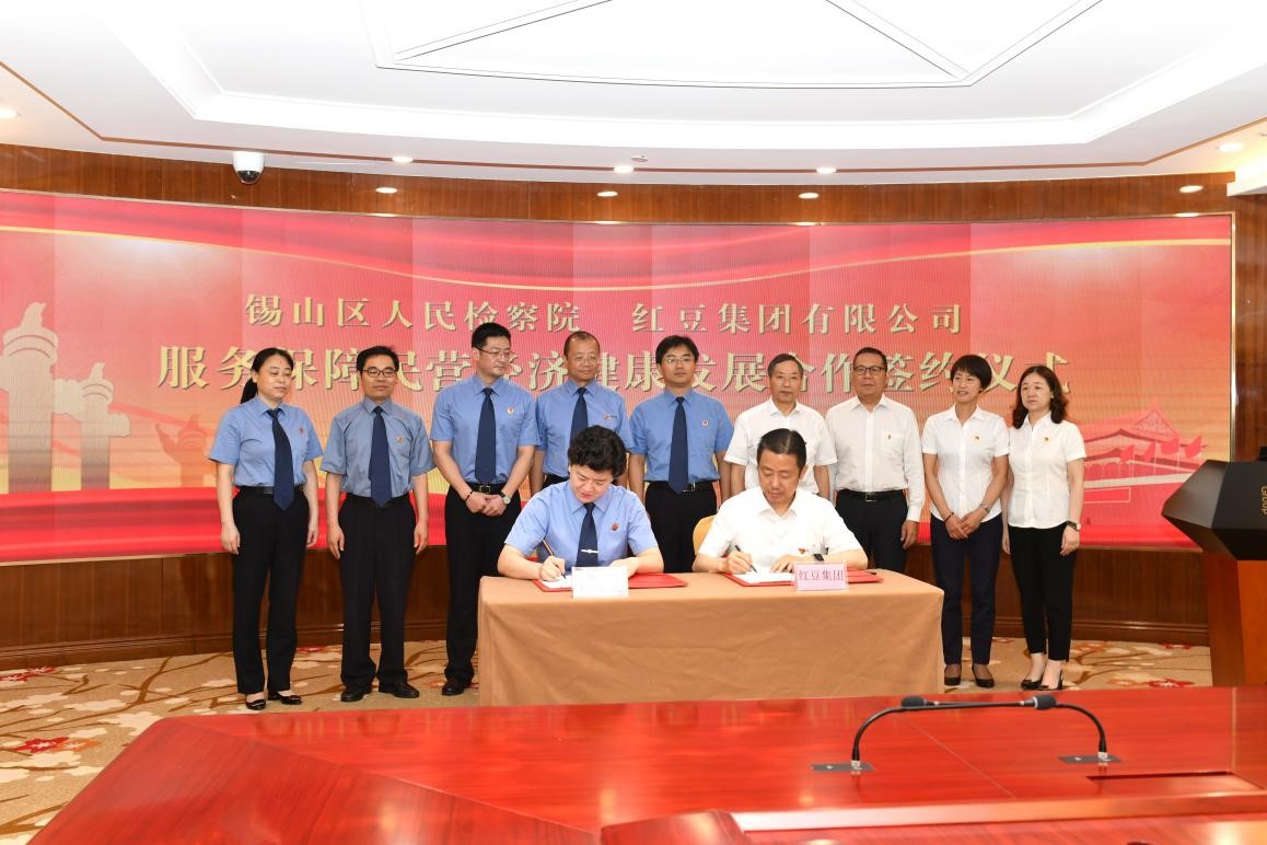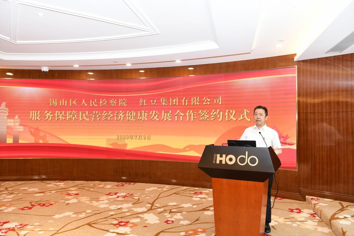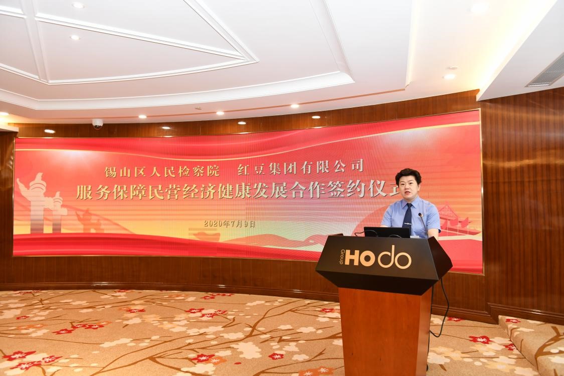 為深入貫徹習(xí)近平總書記在民營企業(yè)座談會(huì)上的重要講話精神,落實(shí)中央、省市委關(guān)于大力支持民營經(jīng)濟(jì)發(fā)展部署要求,充分發(fā)揮檢察機(jī)關(guān)職能,為民營經(jīng)濟(jì)提供優(yōu)質(zhì)的法律服務(wù)和堅(jiān)定的司法保障,7月9日,紅豆集團(tuán)與錫山區(qū)人民檢察院在紅豆財(cái)富廣場北京廳進(jìn)行服務(wù)保障民營企業(yè)健康發(fā)展合作備忘錄簽約。儀式上,紅豆集團(tuán)黨委書記、董事局主席兼CEO周海江和錫山區(qū)人民檢察院何瑩檢察長代表雙方簽署合約。