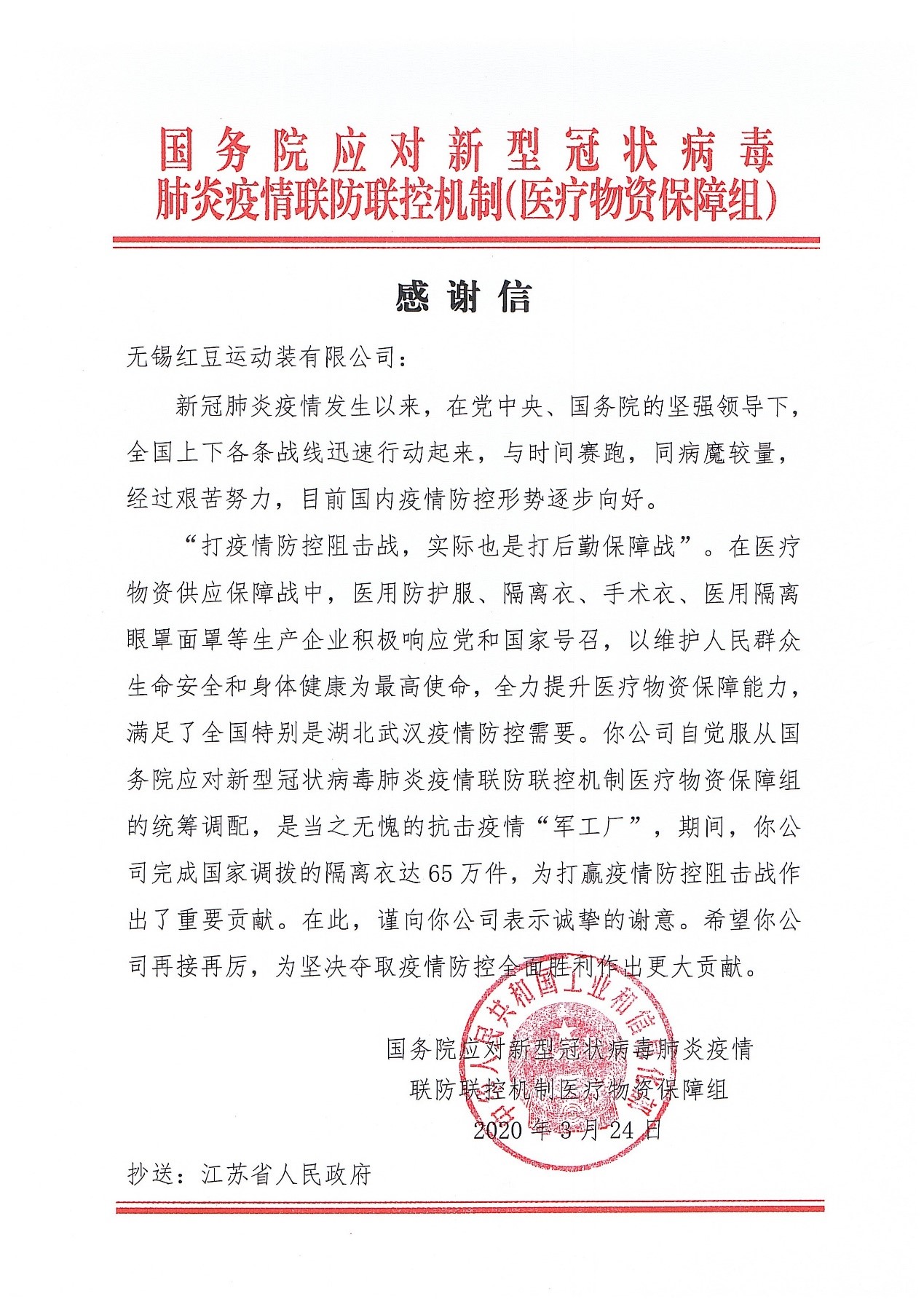 因?yàn)榧t豆在抗擊疫情中作出的貢獻(xiàn),國(guó)務(wù)院應(yīng)對(duì)新型冠狀病毒肺炎疫情聯(lián)防聯(lián)控機(jī)制(醫(yī)療物資保障組)給紅豆發(fā)來(lái)感謝信,稱贊紅豆為抗擊疫情當(dāng)之無(wú)愧的“軍工廠”。9月8日,在全國(guó)抗擊新冠肺炎疫情表彰大會(huì)上,周海江榮獲 “全國(guó)抗擊新冠肺炎疫情先進(jìn)個(gè)人”“全國(guó)優(yōu)秀共產(chǎn)黨員”兩項(xiàng)殊榮,是同時(shí)獲得兩項(xiàng)殊榮的唯一民營(yíng)企業(yè)家。