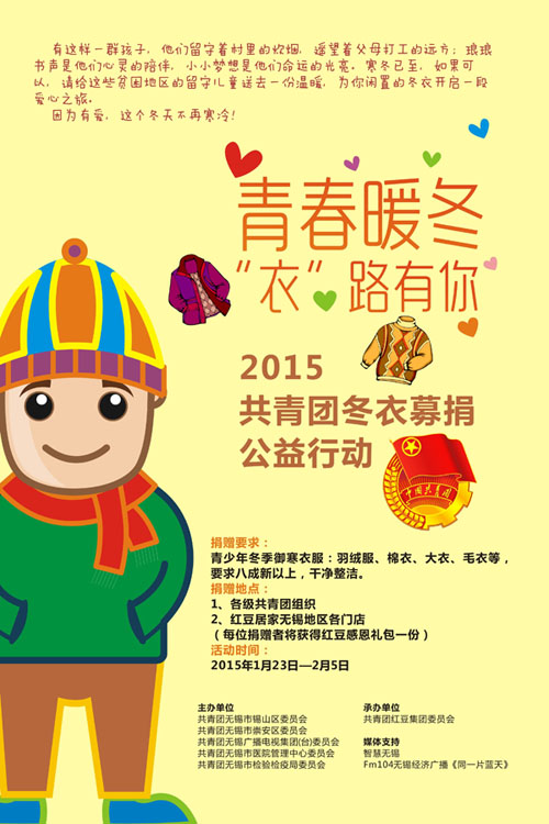紅粉們可以將愛與溫暖通過設計、編寫祝福字板的形式,傳遞向遠方。字板上請注明活動主題“青春暖冬 衣路有你”,祝福話語、手繪可自由發(fā)揮,請將照片發(fā)新浪微博話題#青春暖冬 衣路有你#并@紅豆集團官方。讓愛在我們指尖傳遞起來!